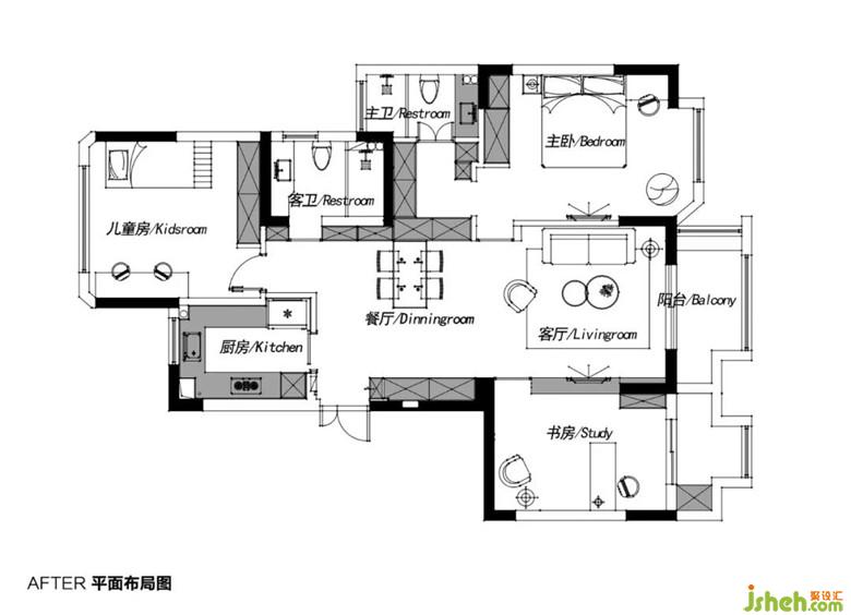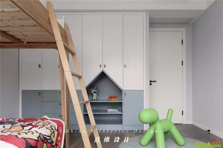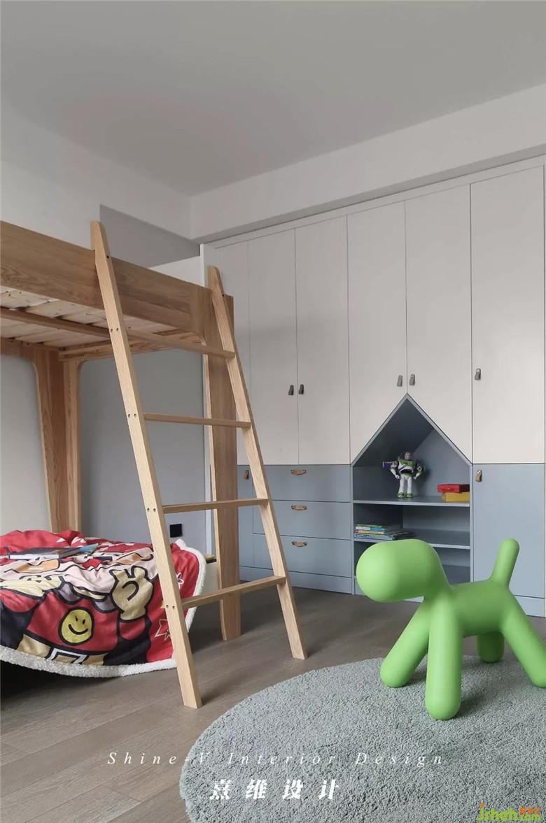 ▲儿童房的衣柜被乳白与灰蓝一分为二,明亮又天真。从功能上除了封闭式衣柜的部分,还开辟了小小一块尖顶小屋形状的展示柜,孩子喜欢的读物、玩具有了显眼便于拿取的位置摆放。柜门与抽屉选择皮质的拉环,避开硬的材质会造成的磕碰。