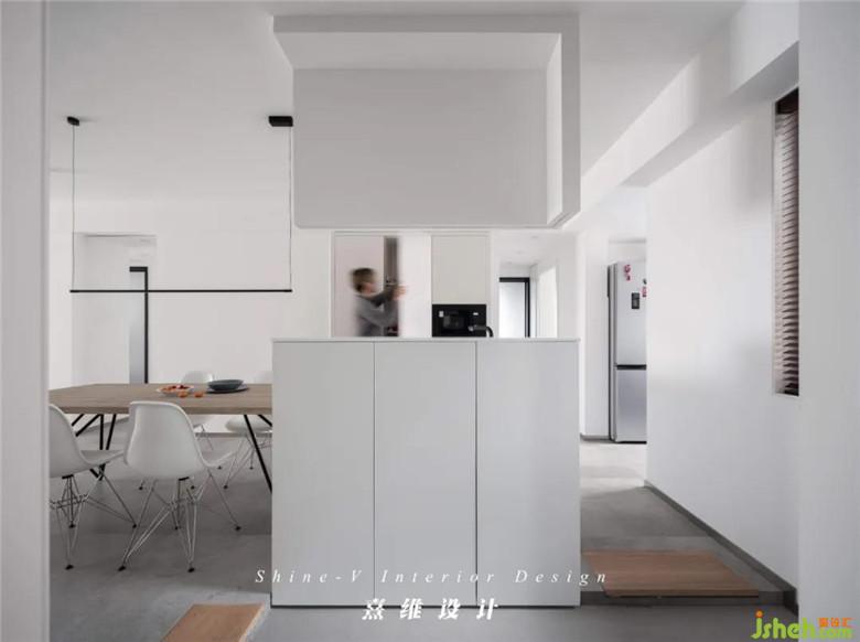 ▲原户型玄关功能缺失,但业主还是希望入户之后家可以不被一览无余的全盘托出。于是装修公司的设计师通过一个紧挨餐厅岛台的鞋柜配合顶部下挂的半隔断,将眼前视线掩去大半。在此处将空间收束紧凑,平添玄关的“功能”与“形态”。