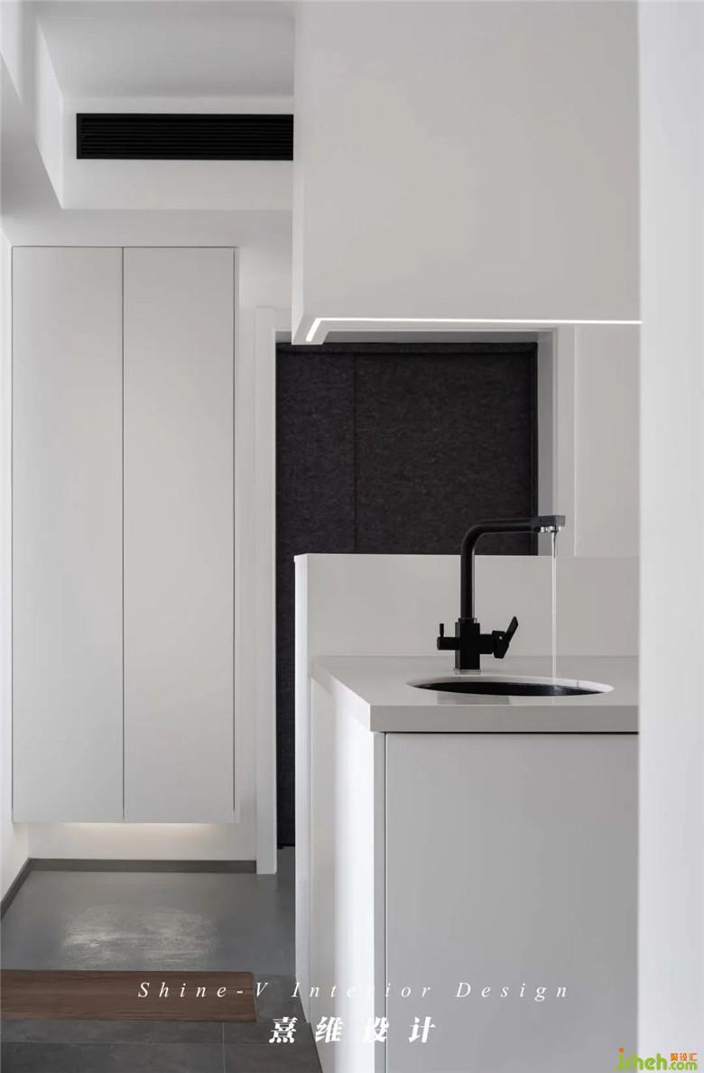 ▲门边的柜子,装修公司为玄关区域补全与周围的白净相匹配的——足够的收纳。半隔断底部嵌入的灯带是微不可察的细节,却是家中才有的面面俱到。