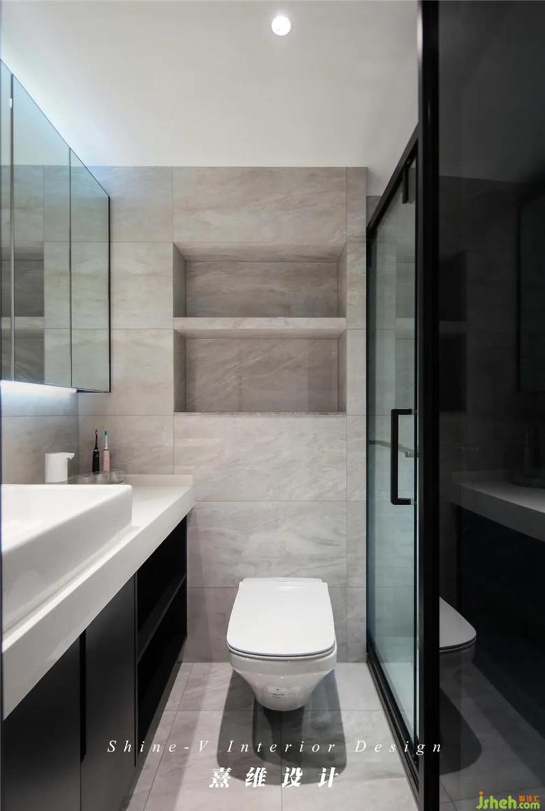 ▲主卫不是干湿分离的形式,装修公司只用玻璃移门做简单分隔。壁龛是卫生间中不占用空间、便利的收纳形式。黑白灰打造这里功能之外的简明扼要。