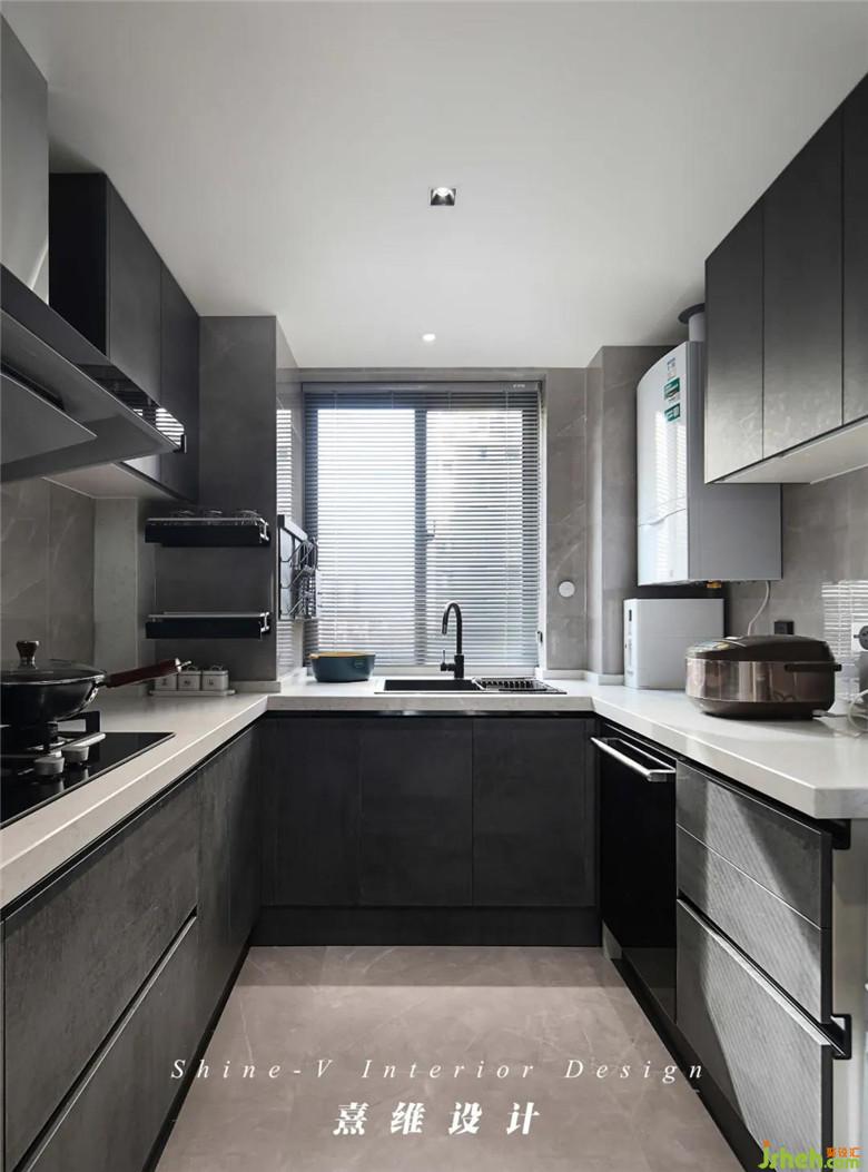 ▲U型橱柜充分利用厨房空间,方便操作,吊柜做到不给高处增加压抑感。灰色耐脏,装修公司大面积的利用完成厨房空间的视觉整体性,操作台面的白色从中亮出,成就了清爽、整洁的另一部分。