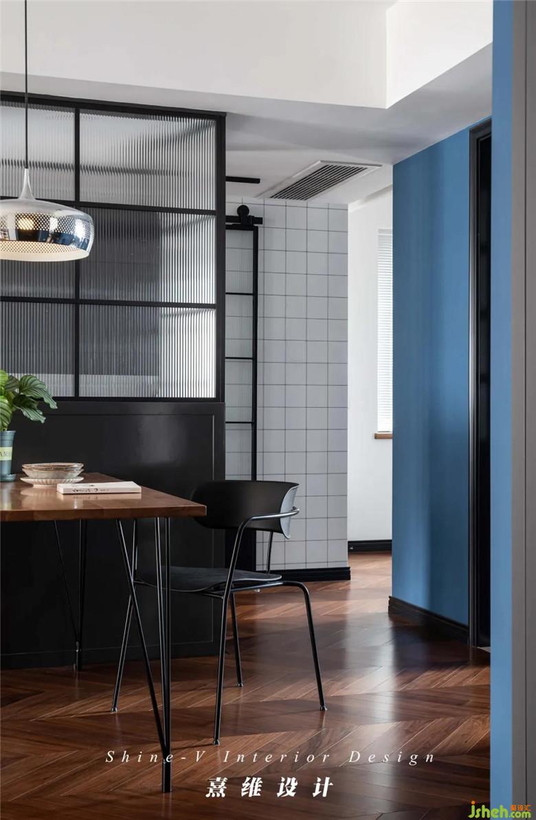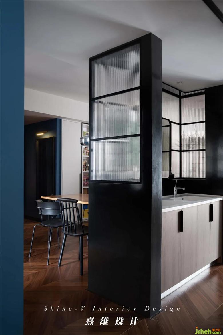 ▲装修公司延伸了的墙面不是整堵实墙,上半部分以纤细的框架与透明的长虹玻璃搭配,成为了餐厅的背景,并不邻近窗户的餐厅也像是有了窗户,而私密空间被护在了内里。