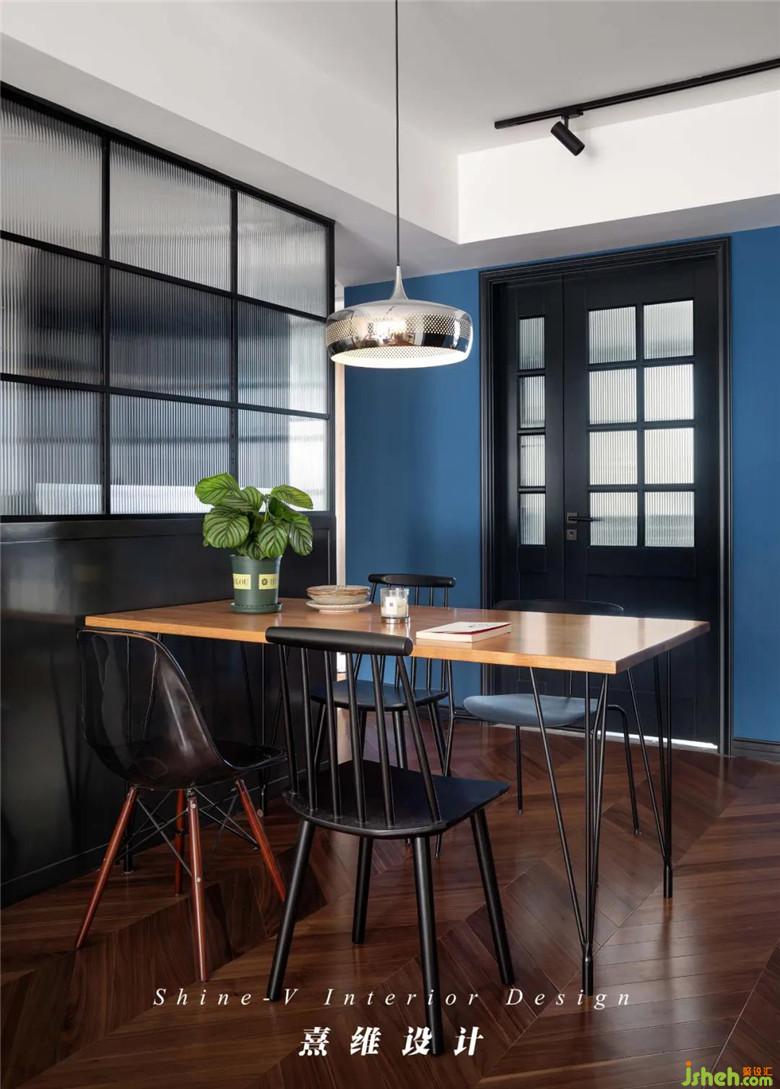 ▲厨房门边的墙涂成蓝色,作为餐厅一部分的配色,在同一个空间之下,与客厅的白色区分开来,装修公司设计师利用同色同质,却不同形式的门与墙,让细节众多的小空间显得精细又整体,自由与灵活堆叠在复古式鱼骨直拼地板上,通过对功能的提纯使得自在变得容易获得。