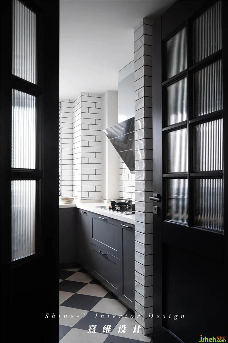 ▲扩充之后的厨房内部,设置u型橱柜保证操作空间充裕便捷,餐厨电器被妥善放置在外间,用带长虹玻璃的字母门配较宽的门洞,让自然光尽可能的在各个空间中穿行,也是适用于小户型的小小仪式感。