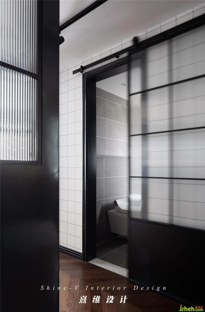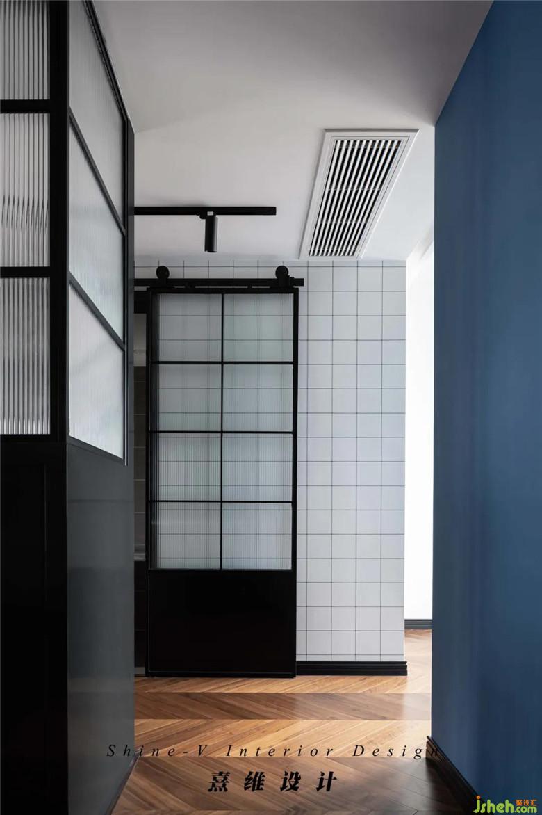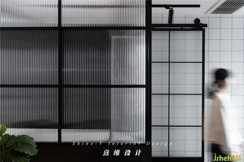 ▲卫生间湿区抛弃传统的类型的门,选择带长虹玻璃的谷仓门,极力扩大走道处的采光与通透度。