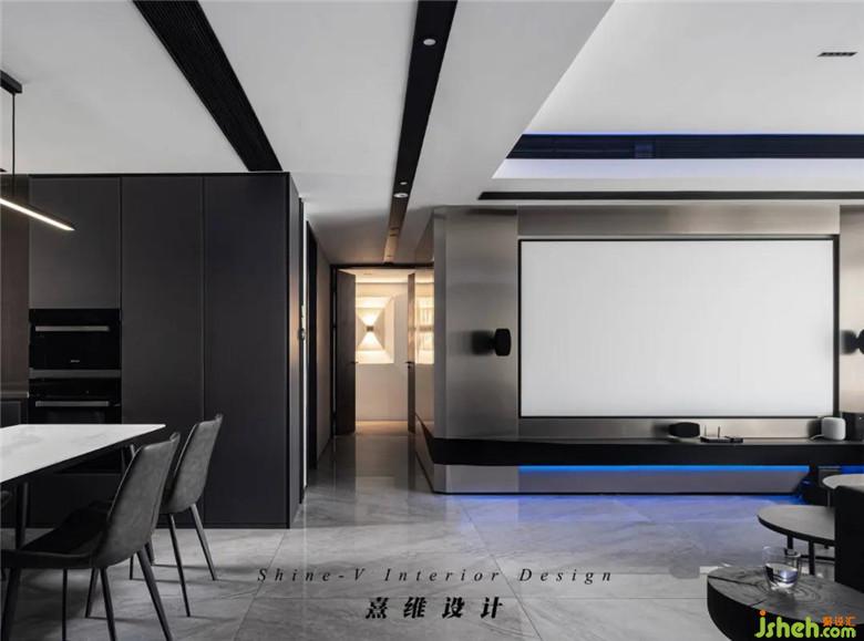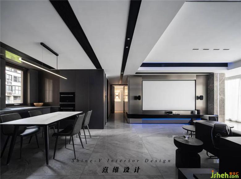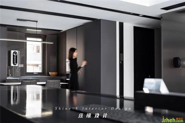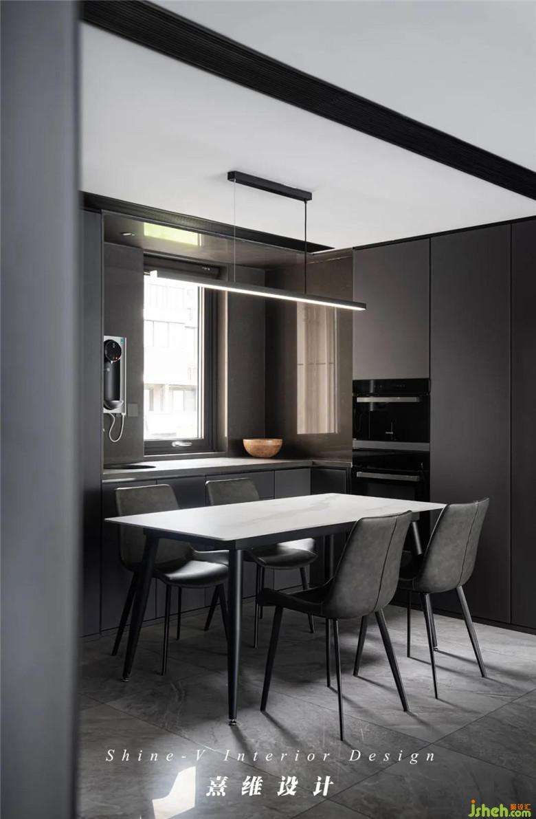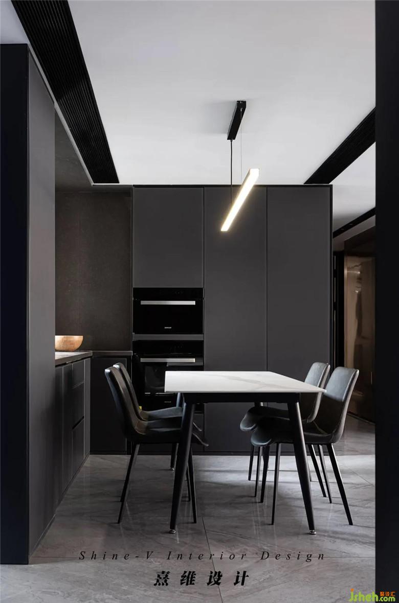 ▲到顶的柜体包容餐厨电器及杂物,与岛台的地柜建立连接,为餐厅提供可观的存储空间。贯穿在空间中的深灰色柜体,哑光烤漆观感细腻,连续的手法消除独立感,于开放的空间中创造具有质感的精神场域。