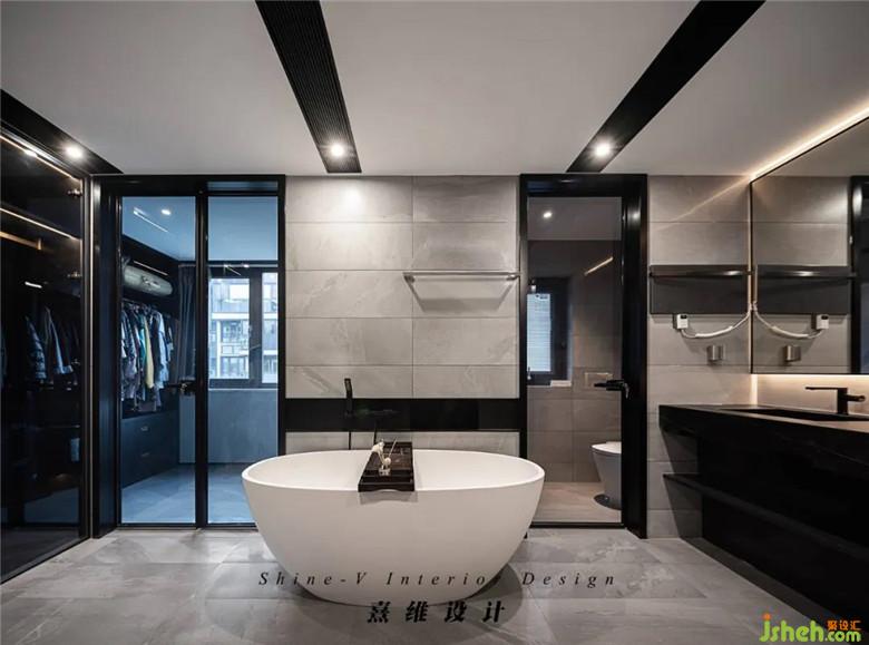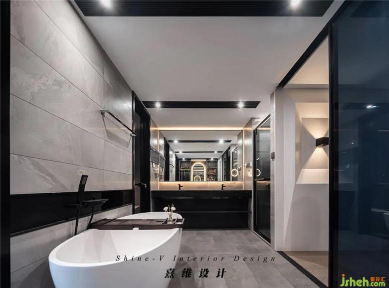 ▲装修公司将原主卫空间与邻近的零碎小房间整合在一起,成为主卧套房的一部分。由于补充了足够的空间,功能性得到极优越的提升,浴缸放在中央,干区与梳妆台分布在两端,衣帽间、马桶、淋浴间独立于三个角落。空间没有分毫浪费,模块之间相互关联又互不打扰,在一起充分回应使用者的需求。