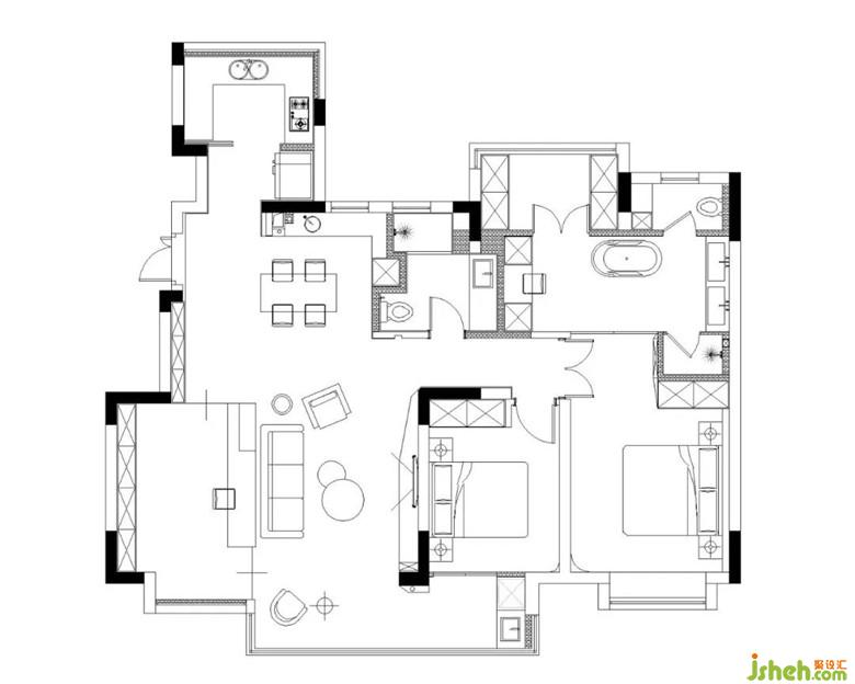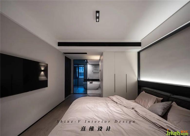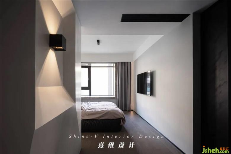 ▲仍以黑白灰着眼与主卧,黑色的色块与线条勾勒出床头轮廓,其间被衬托出的灰浅浅的拓展出温度情感,白色的柜体紧挨黑色的线条,若月下见,轻薄的样貌呈现出深邃与温柔。