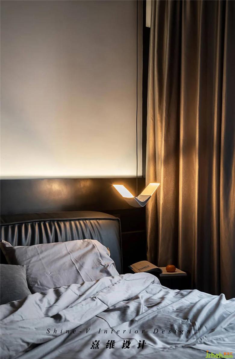 ▲床头的吊灯是轻盈的V型,像振翅的飞鸟,翅膀耀出暖黄色光,它只照床头小小一块地方,陪伴睡前的时光,在简单而柔软的居所里拥有一床清梦。