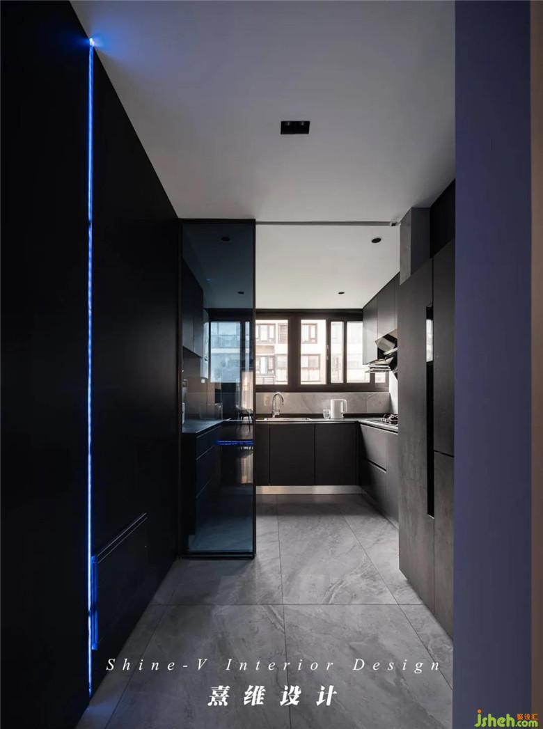 ▲入户门一侧的小房间连同阳台被改造为中厨,用玻璃推拉门作为隔断,保留空间过渡地带的明亮通透。U型布局的哑光灰橱柜加上双侧的吊柜,操作空间、收纳空间维持在最大,以真实的生活体验感作为规划的重点。