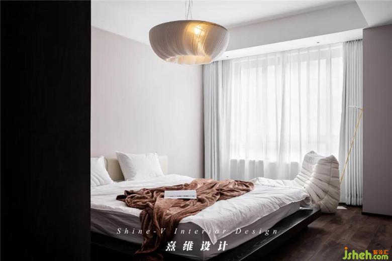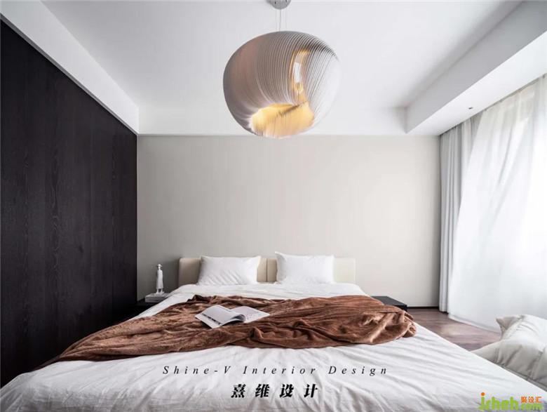 ▲低彩度的裸色墙布搭配一面深色的木饰面,被光照射着,细腻纹理与光滑表面的明暗转换将空间多面向的层次尽致刻画出来。卧室的主灯以最柔和的色彩演绎最层峦细致的造型,丰富空间内部的秩序感细节,永远值得驻足值得停留。