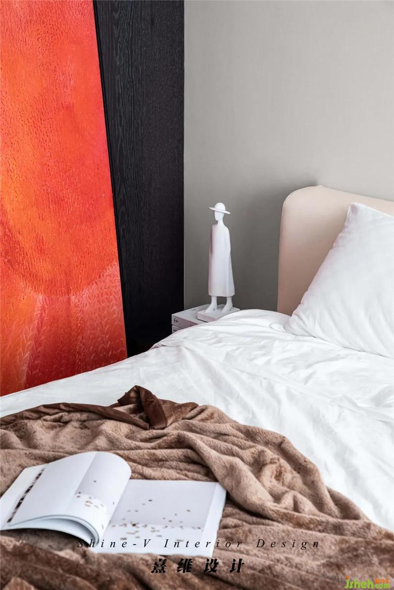 ▲一幅橙红的装饰画是静谧木色中的绝对主角,从无声的映画中跳脱出来,开启热情一瞬。