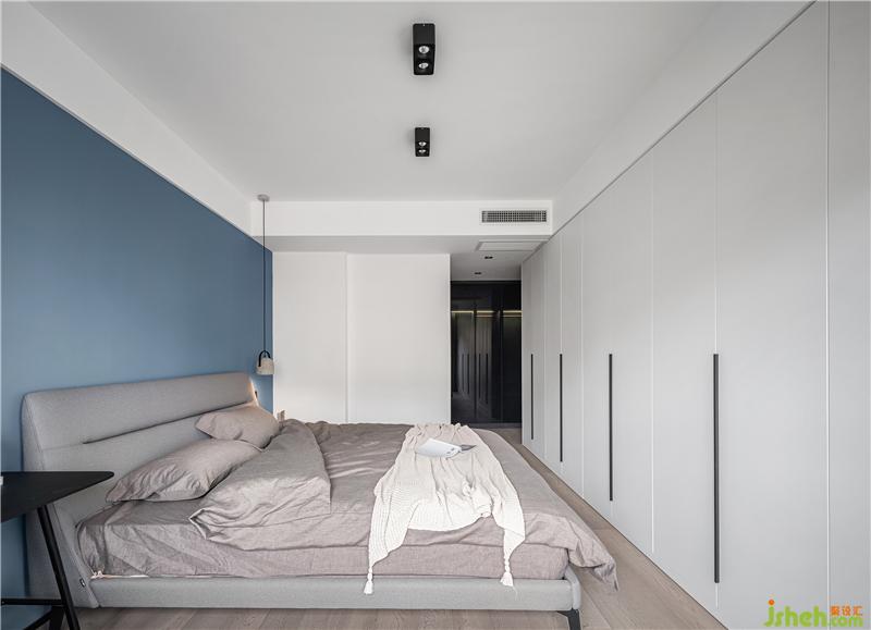 ▲整面收纳空间集中在此,外观仍以白色表述。通过外层的半透窗帘追溯光的源头,再行至床头处,梳妆台和床枕在静水流深的一面蓝色中,柔光浮动,空间带着淡意的暖色。