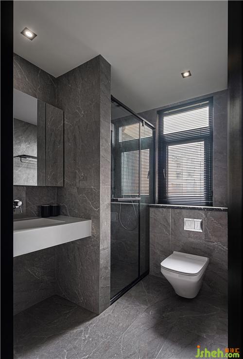 ▲客卫空间相应扩宽,干湿区合并,利用新砌墙体的凹凸,使台盆与淋浴区隔窄墙相邻,墙排马桶进一步节省空间,明确合理的将功能规划齐全。