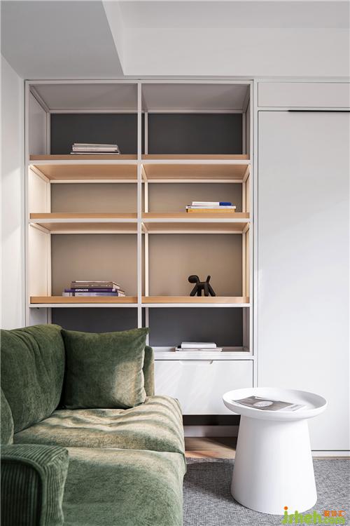 ▲多功能空间中摆上沙发和小边几,承担起小客厅的职责,家人起居或小范围的好友聚会,这些生活中的放松惬意即使在不开阔的小空间中也可以被妥善安排。墙上设置充分的置物架和抽屉,作为尽量方便拿取的储物地,装修设计叠加的功能体块与空间相互影响,保持轻便明亮之余,延功能的脉络追溯生活。