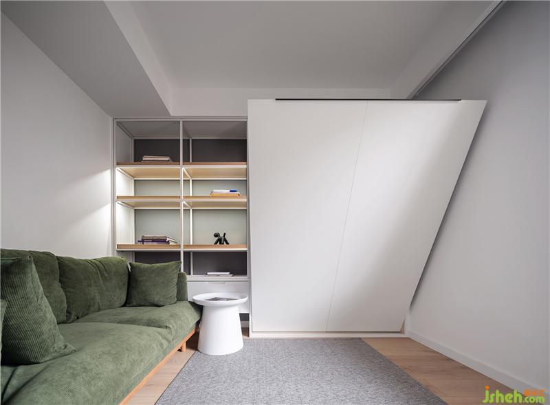 墙壁的另外一半,放上可以折起的墨菲床,为这个独立空间添置临时客房的规划,柜体、沙发,甚至再加上一张床,多重功能交汇之下,考量平面立面各个层次的功能分配,装修设计让小空间里高密度交错的功能互不打扰,坦率的共存,达成有序、高效的区域利用率。
