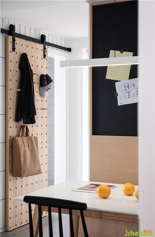 老房户型总是对改造有颇多限制,卫生间的门正对入户处,由于承重墙而无法改变现状。用直接的生活经验打磨细节,谷仓门贴近墙面,开合也不会影响走道空间,有特点的外形尽量降低内部是卫生间的印象,正面覆上一层洞洞板,作为入户收纳功能的补充性存在。