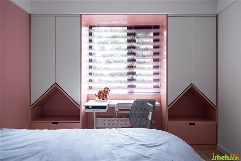▲两个一样的衣柜属于两位小女孩儿,上方挂置衣物、中部开放展示柜、下层抽屉,细化后的功能分区从小培养出条理性。窗户被衣柜合围,书桌摆在窗前,靠近天光,景框设计描绘孩子学习、娱乐等功能化场景。