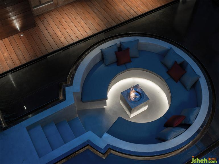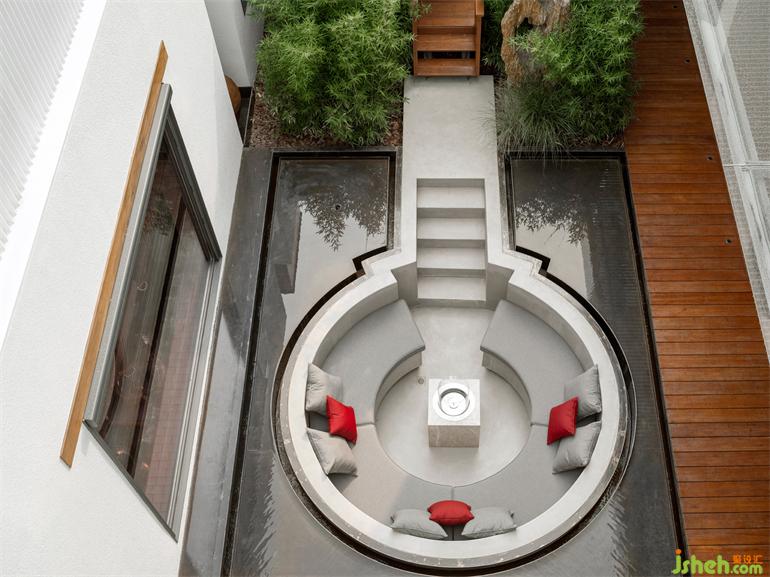 别墅装饰设计师在房子的中央插入了一个类似亭子的区域,把紧张的、人工的内部空间打通放进环境里。水泥围合的下沉区嵌入薄薄水面,小孩们常在庭院的水池间来回跳跃,水面的宽度刚好适合他玩耍的步幅。