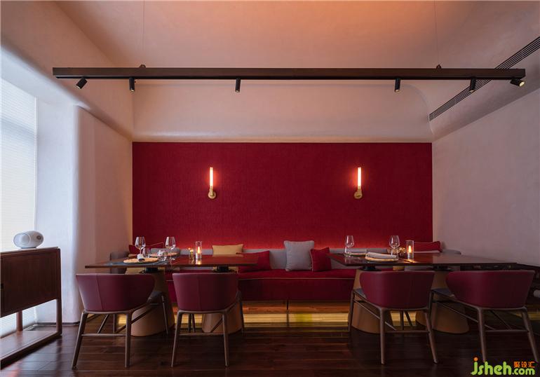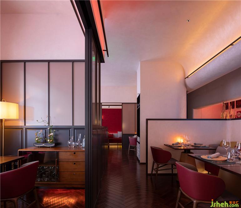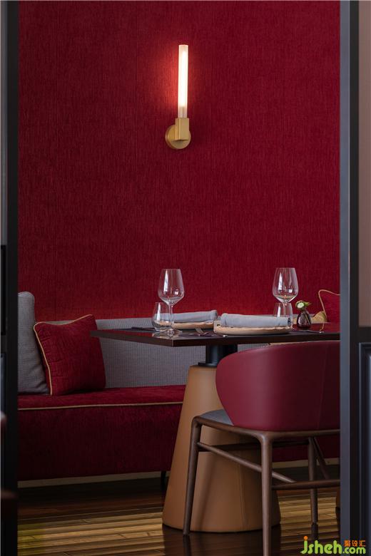 餐厅设计立面上,艺术涂料与壁布拉出层次;黑色金属条勾勒边缘,与浑厚结实的弧面线角形成律动;沿用老店具有识别性的红,加以矫正后体现在丝绸、丝绒与皮革面料中;雀跃迷幻的红、黄、蓝多色灯光渲染出巴黎撩人的暧昧迷情;深胡桃地板依照法国规制铺贴,与老店旧物一同将整个空间剧场拉入深沉背景中。