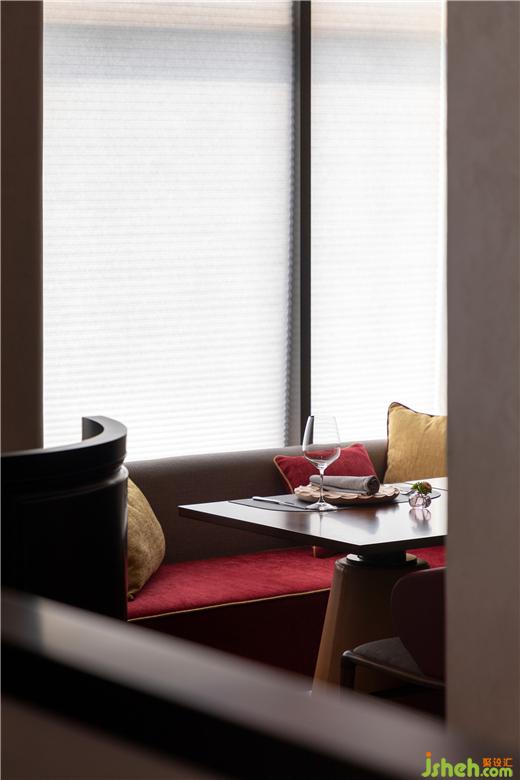 经玻璃过滤的柔和天光充满餐厅,食客将在走动中感受洁净的现代感,餐厅设计一旦落座随即沉入复古旧景,包裹恰如其分,私密而无压迫。
