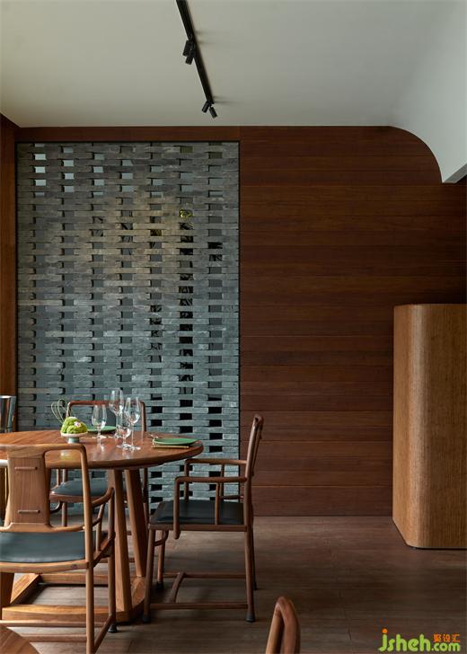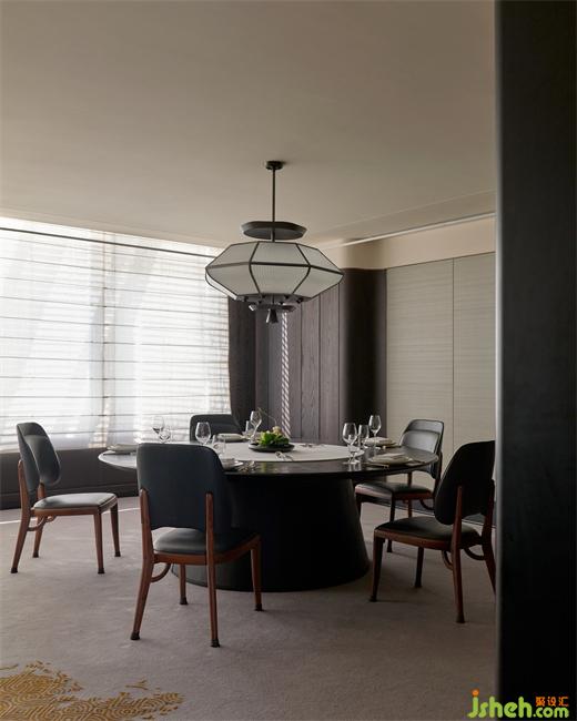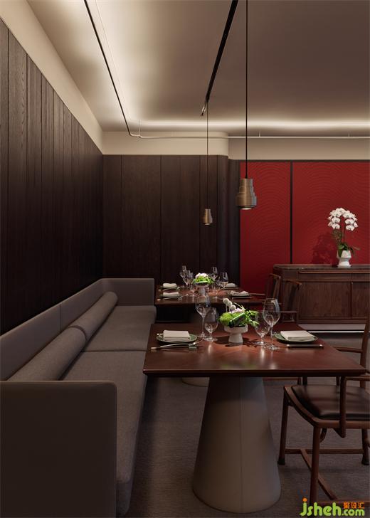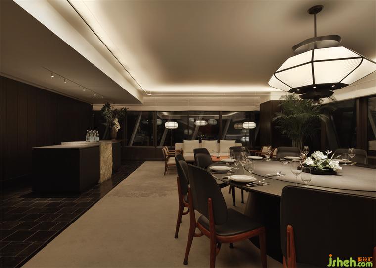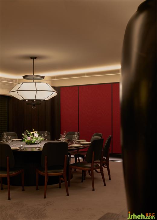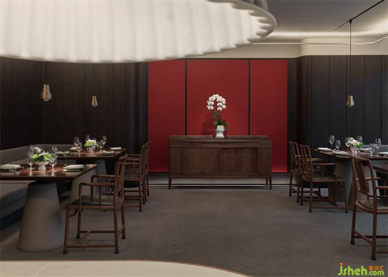 室内大量使用了由宋明家具改良而来的原创家具,菱形编织的地毯以凹凸云纹、水纹向留白铺陈,虚实相映。少量形制简洁的意式家具穿插其间,做传统与东方向全球语境的过渡,而这也符合餐厅的商务定位。