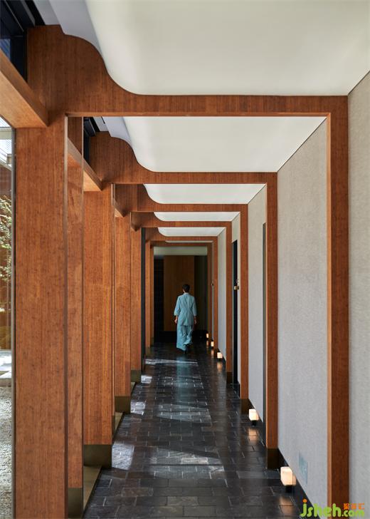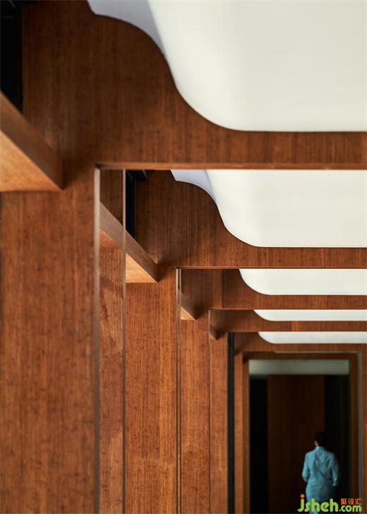 在不改动空间结构的基础上,餐厅设计调动写意与白描的处理手法,大笔触铺陈内部,游刃有余地运用竹皮、竹板、长城砖交叠,与原始结构穿插共构,结合大量留白,完成内部丰富的“山水地景”,与园林有相映成趣之感。在此基础上,更为精巧简洁地勾勒筋骨,中国传统文脉中官帽、如意、拱的形态彰而不显,却柔韧有力地撑起整个空间,如打磨近四个月的灯笼,端然简洁。