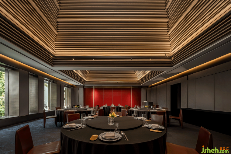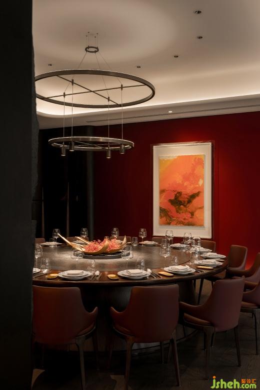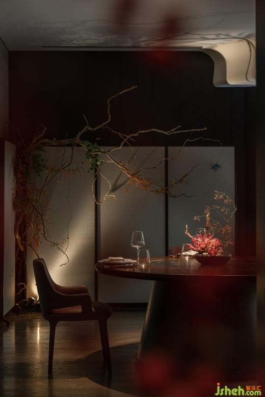 包房则可以视为一个内部独立体,它与其连通的茶室和更深处的娱乐空间形成了一个可以独立探索的路径和小世界。天光与火的意象在包房中点题,艺术性幻化为深远的色彩、精雕的现代艺术、浮动的音律、藤蔓低语的暗影。