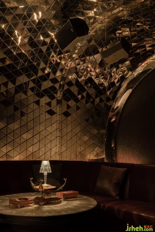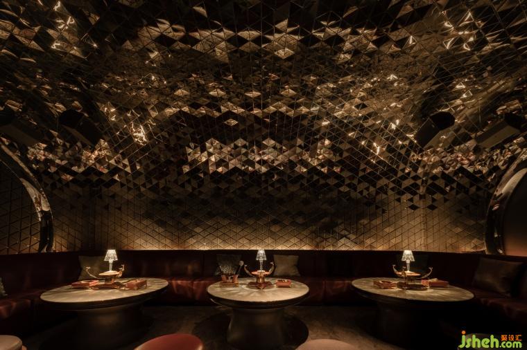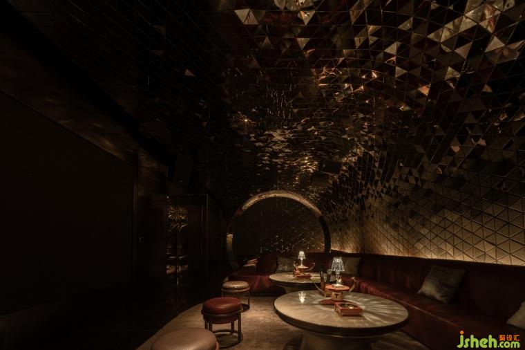 Through the entertainment area, the space suddenly dazzles. However, it does not merely follow a trend of visual spectacle; instead, it adorns entertainment with a grand, tranquil elegance. The designer meticulously cuts stainless steel into 100mm×100mm triangular pieces, which are then hand-welded and integrated with captivating materials and craftsmanship, covering both the façade and the ceiling.