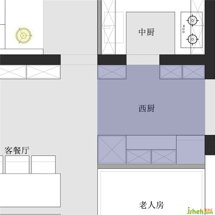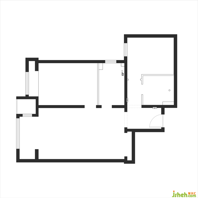 这个户型是令人头疼的直筒户型,仅有南、西几处窗户。南北纵深,承重墙阻挡下,一部分空间天然处于阴影位置。