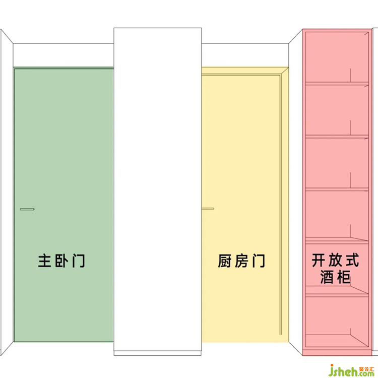 同理,在卫生间的拐角处设置家政洗衣柜,借用卫生间和过道的区域形成家政区,在此集中进行洗衣烘干之后,再将衣物分发的各个卧室。