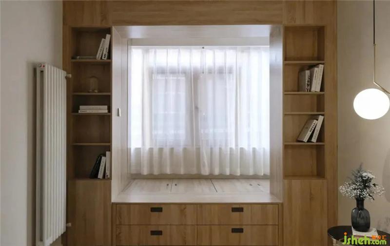 整个区域下方都做成了储物柜,北京装修设计提升了整个空间的利用率,同时两侧也改造成开放式书柜,女主人也可以在这里静心阅读。