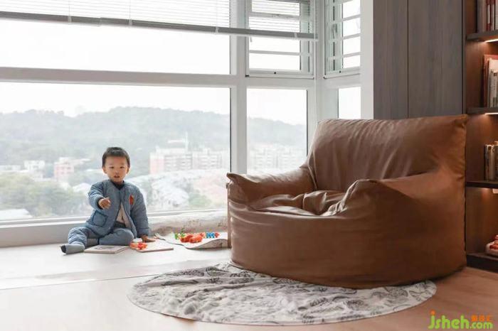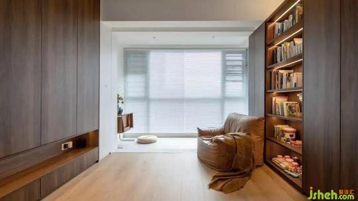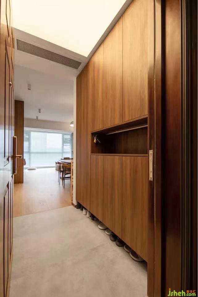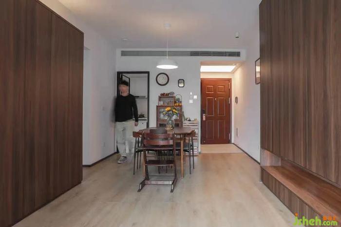 室内设计师根据屋主的喜好,整屋采用了胡桃色作为主色调,玄关设置了顶天立地的高柜,为一家三口打造了充足的收纳。