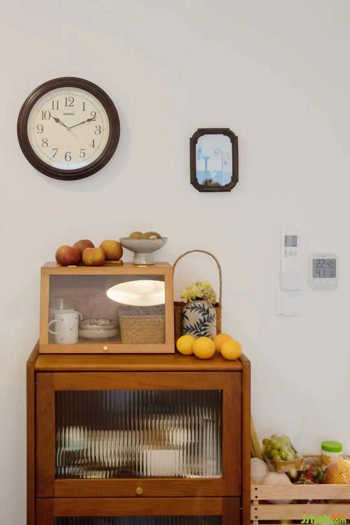 长虹玻璃门搭配黄铜把手,为餐厅营造出几分精致感。室内设计师墙面用复古的钟表和木制画框做点缀,有几分旧时光的风情。