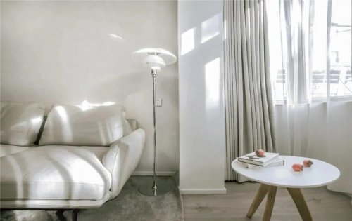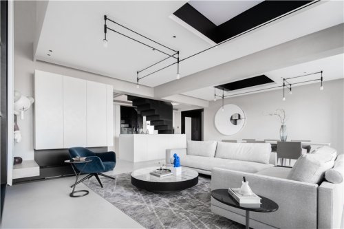 在房顶的处理上,我们取消了之前老气的环形吊顶,一侧的收纳柜直通屋顶,室内设计师像一面墙而存在,弱化体量感。梁下的空间也没有浪费,做了一个窄柜,柜体采用白色,和梁融为一体。