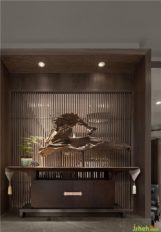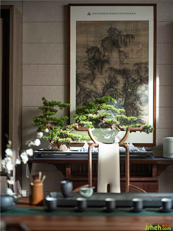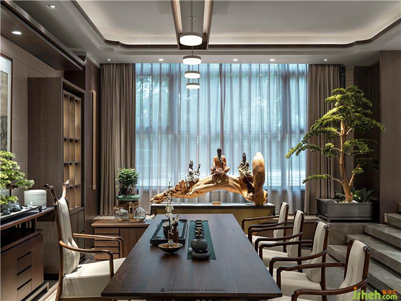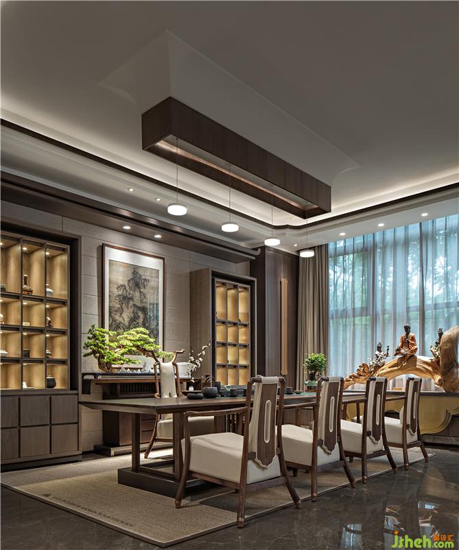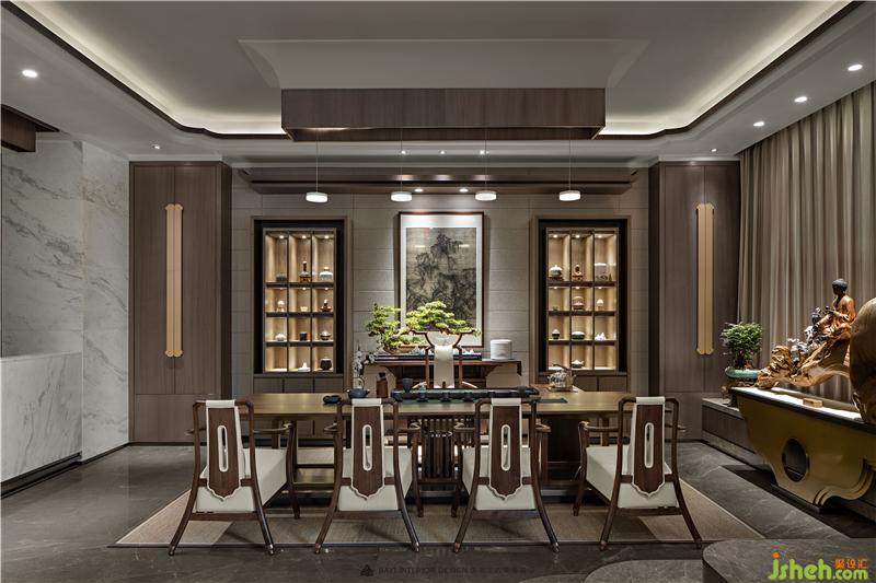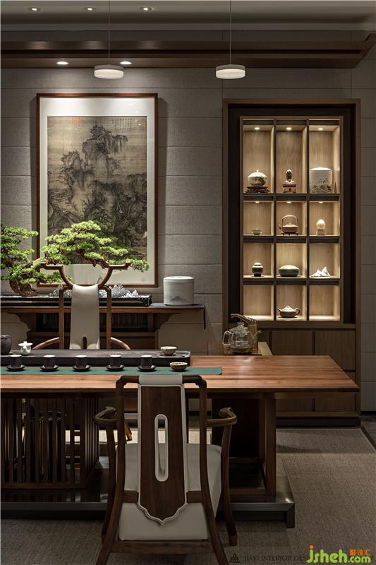 居者,礼待天下。宋式官帽椅坐立正中,仪态沉稳端庄,副椅周围环绕有序有章,彰显贵宾礼遇。主椅背景左右对称,有物有序,素雅不失高贵,一巨幅山水画自上而下,为整个空间带来大气磅礴的气势。帘前白纱似透非透,以“空”摄“实”的朦胧里,燃一线香,沏壶好茶,架上藏纳古物雅玩,谈笑风生看沉浮,闲情逸致存高远,何其自在。会所设计