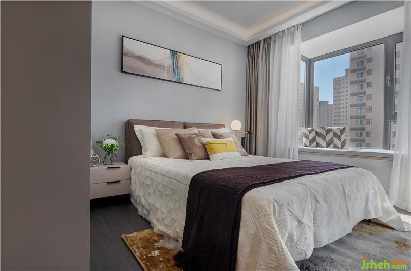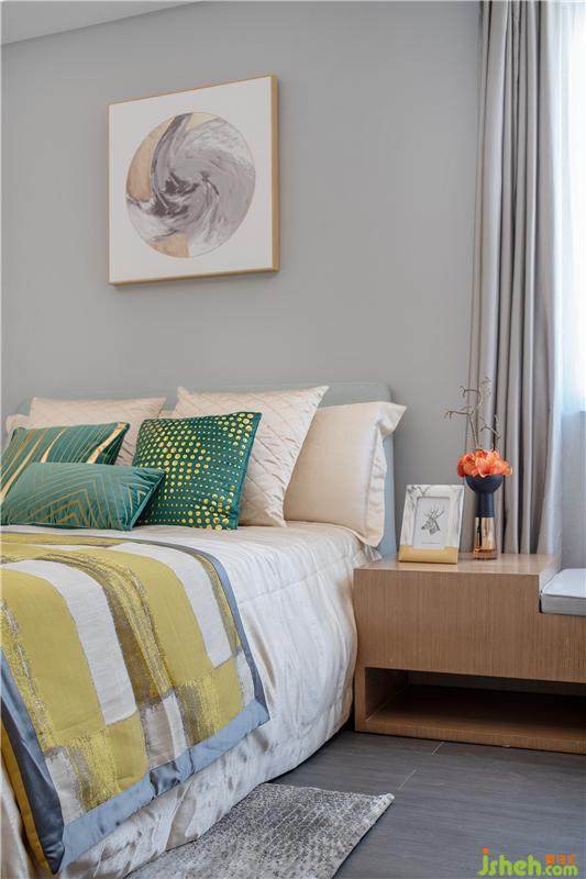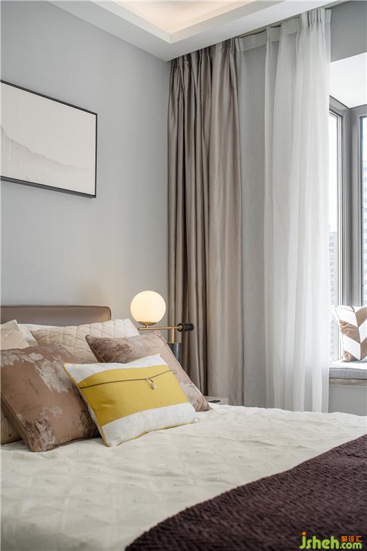 客卧的飘窗搭配双帘,自然光线流入房间,时而开放时而隐秘;精美床品,脚边花毯,整体氛围令人见之心生柔软。以居者为上,还原舒适本真,便是精致之作。
