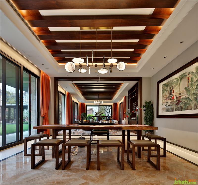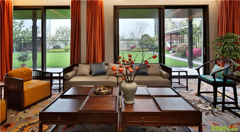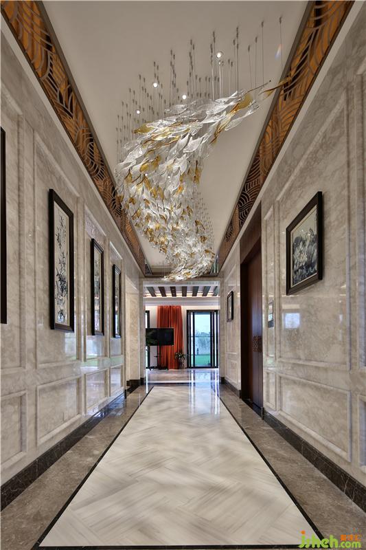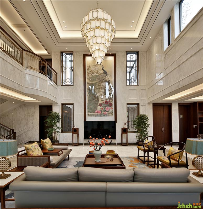 室内硬装方面运用大面积的大理石铺设以及软装方面中式家具的选择、国画的点缀,在空间中显出别有风致的