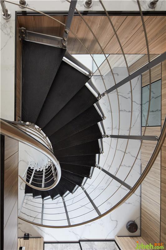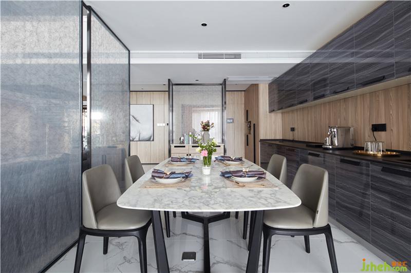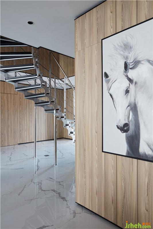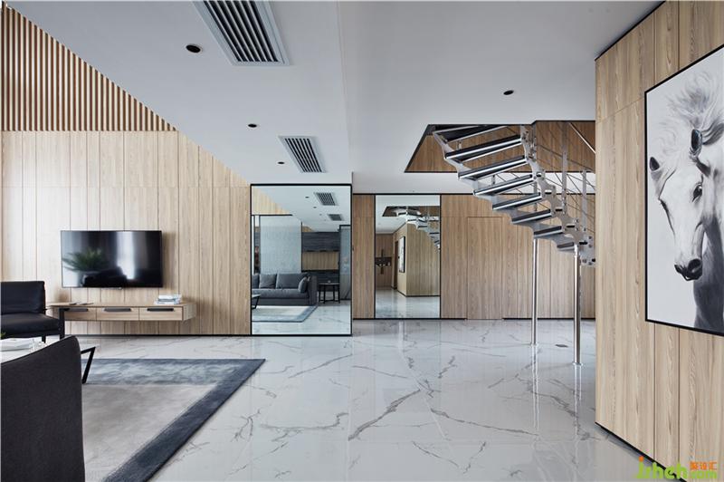 主材名称:雪花白大板瓷砖,浅灰色护墙板,夹丝艺术玻璃,灰色木地板,黑色金属收口件等。