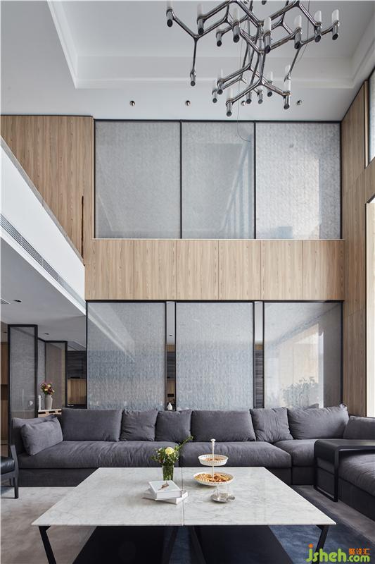 客厅的挑高空间,是整个项目的最大亮点,我们希望整个空间能体现年轻而不失品味的质感,所以地面用了大面积的爵士白大板砖,墙面我们则选了浅灰色的成品护墙板,一楼的餐厅隔断以及二楼娱乐室的窗户,通通用夹丝艺术玻璃来装饰。黑-白-灰,通过不同材质和比例的呈现,一直都是经典的搭配方案。整个设计中,最吸引的软装搭配就是这套宽大的沙发了。