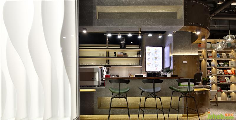 主要材料:水磨石、铁皮做旧、实木书架、水泥肌理漆、白沙粒、亚克力材料、消防管道、深灰色涂料