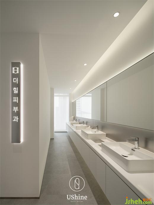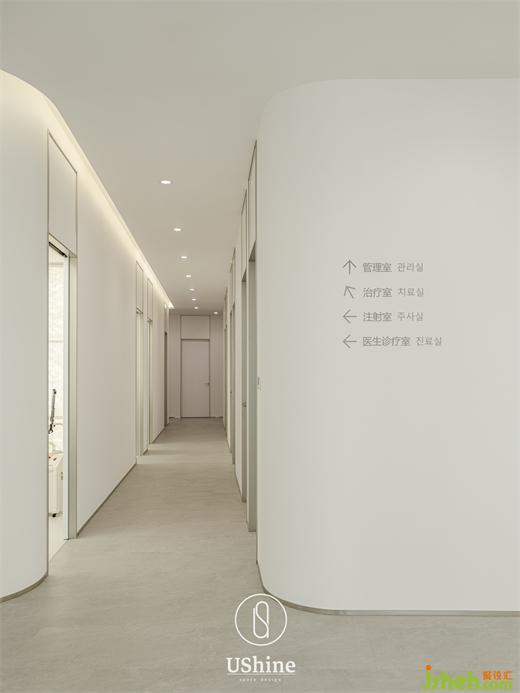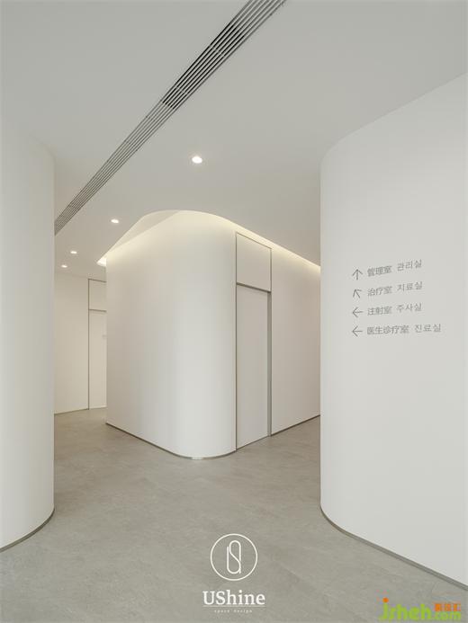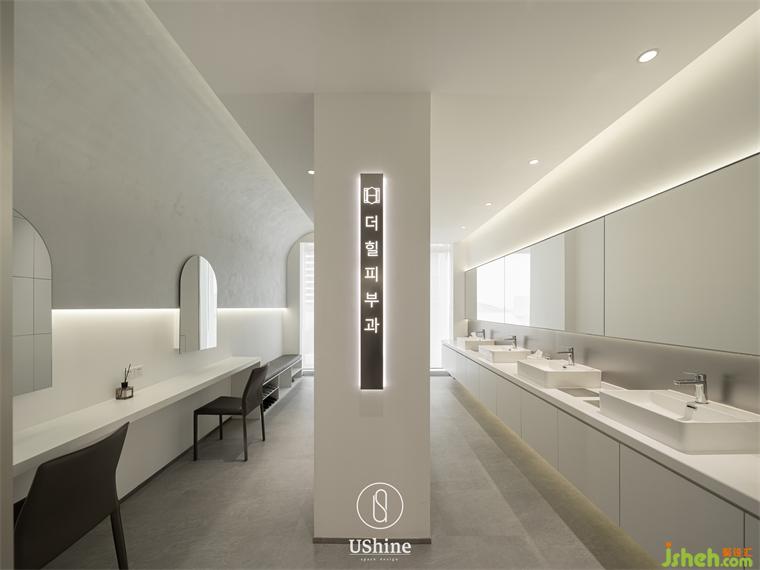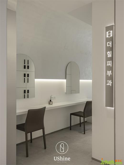 顾客准备间为半开放式,沿两侧依次分别设置单人盥洗和整妆位置,深圳赫尔医疗美容诊所装修设计中间以极简风格的储物柜为隔断,柜体面向入口的一侧设置导视。