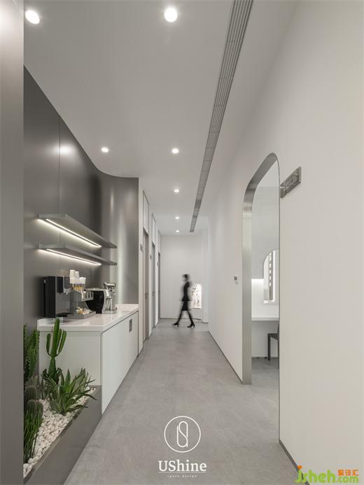 大厅区分了诊所的左右两边,左边是咨询、顾客准备和供医护人员使用的功能区,将过道紧邻前厅的位置推进去,嵌入开放式水吧,便于人员接待和顾客自用。紧邻水吧的热带植物群落,与走廊转角处的观叶植物呼应,引入自然的气息。