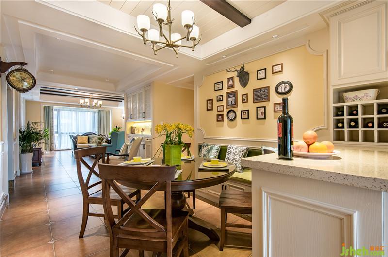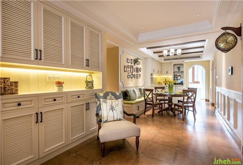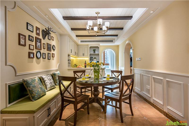 将不作太多雕饰或完全不雕饰的实木做假梁,线条简单,保留了木材原始的纹理和质感,来装饰顶面,体现了美式乡村风格原味的设计特点。左边卡座的设计一方面为餐厅节省了空间,另一方面让西厨显得大气许多。