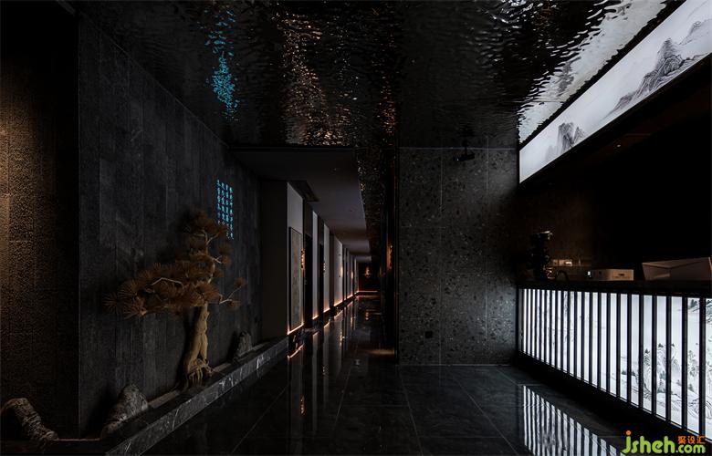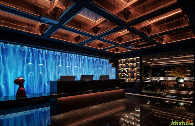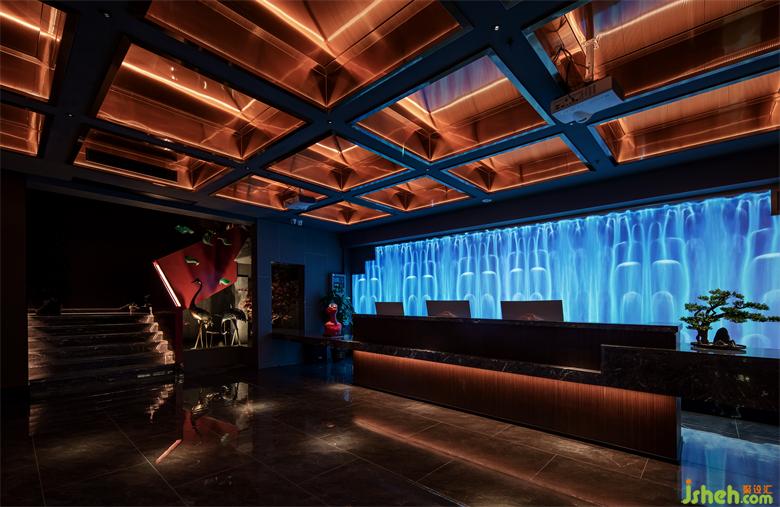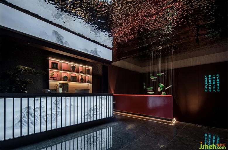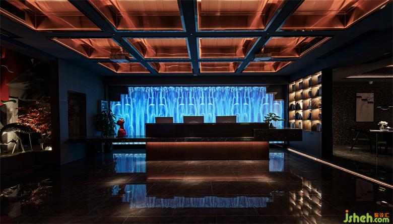 足道设计空间入口以退为进,增强内外交互。大堂及前台兼顾美学与功能,以实现快速为用户办理选房及技师安排等为前提。前台的背景将赣派建筑代表元素马头墙,与全息投影自然融合,利用现代化的手法,打造出符合当下城市生活的东方意境。