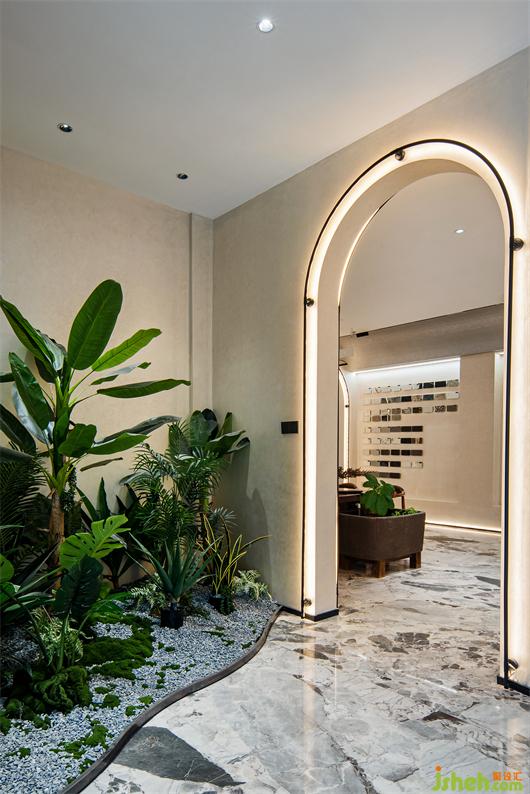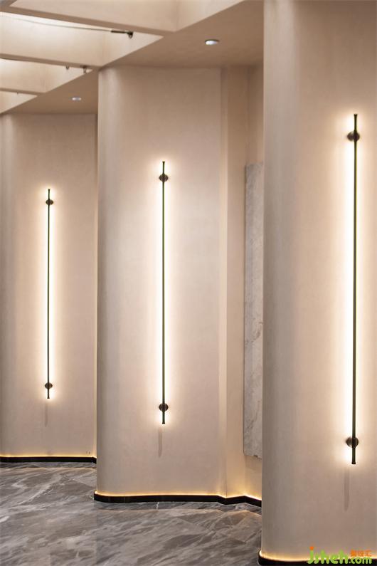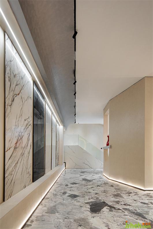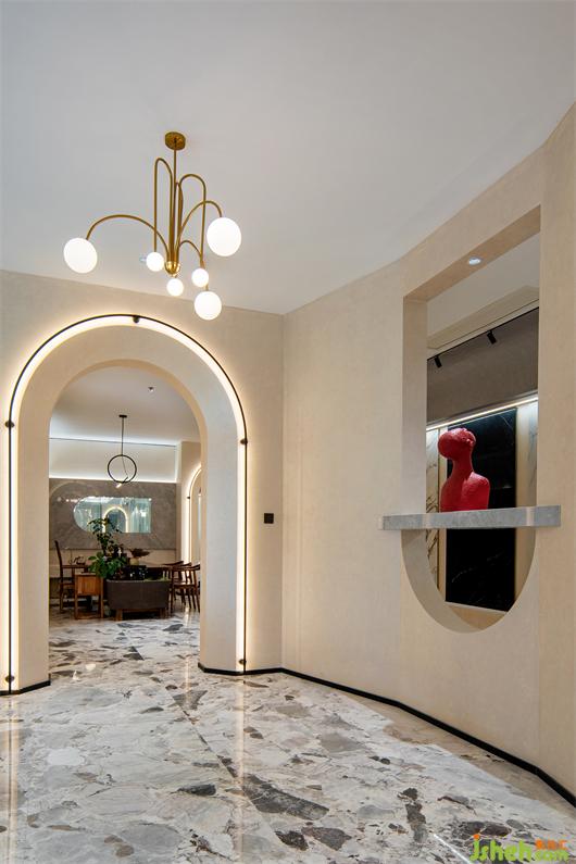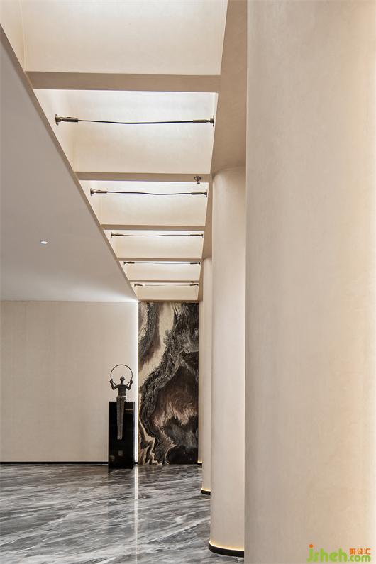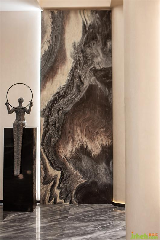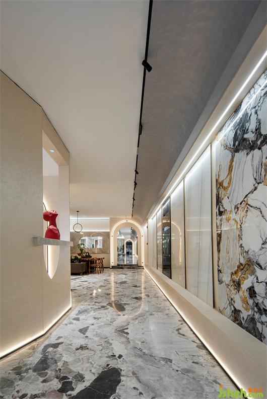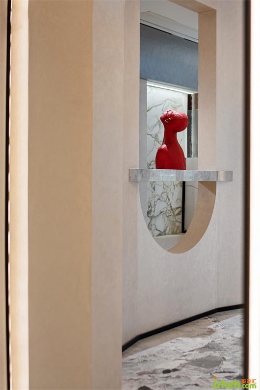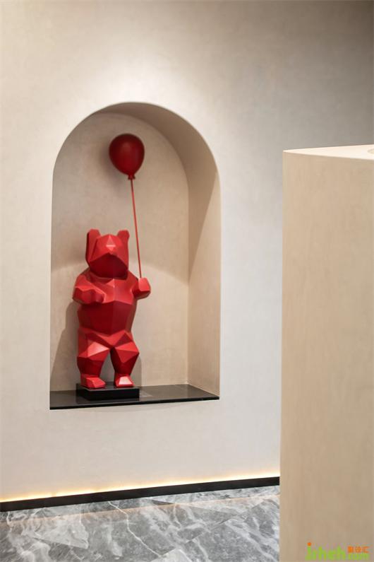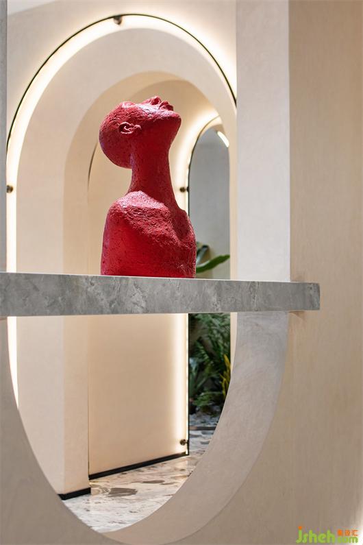推门而入,入口处墙体被石材包裹着,线条的流动性和秩序感丰富了空间层次,呈现出强烈的韵律感。红色艺术装置的运用,柔和了石材的刚硬,也予以视觉醒目感。
