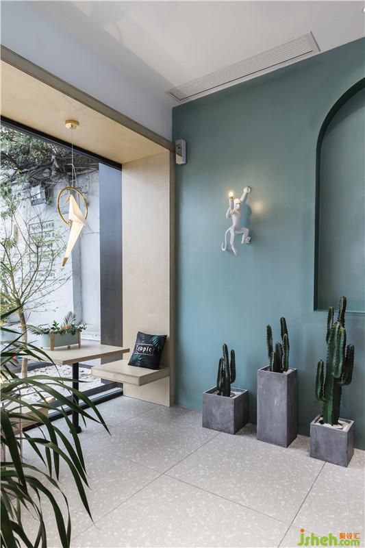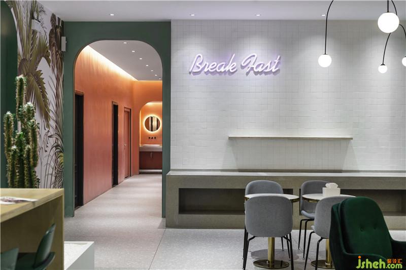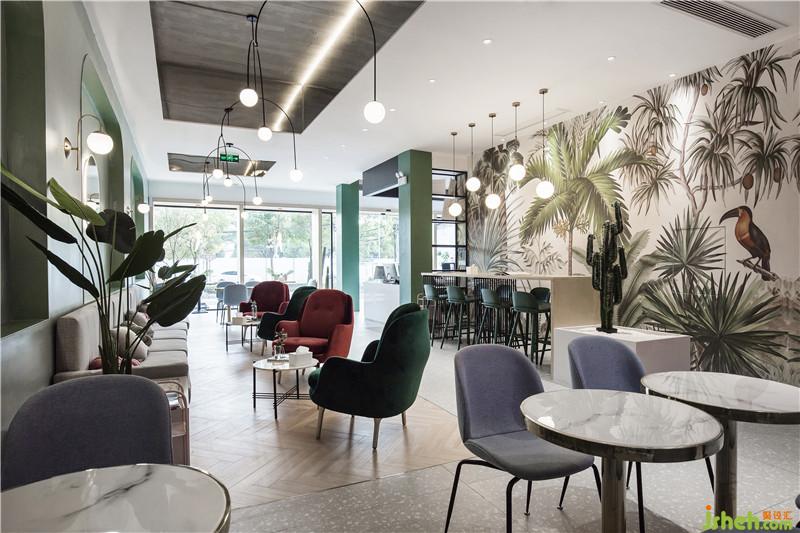 · 大堂中摆放的植物、墙面深浅渐变的绿色、热带雨林墙纸以及球形的柔光灯勾勒出轻松的氛围,客人可以在这里享受早、午餐或者是点一杯咖啡奶茶安静的度过一段美好时光。而大堂时尚的热带雨林氛围也深受年轻人的欢迎,一时间成为年轻男女争相前往的「打卡胜地」。