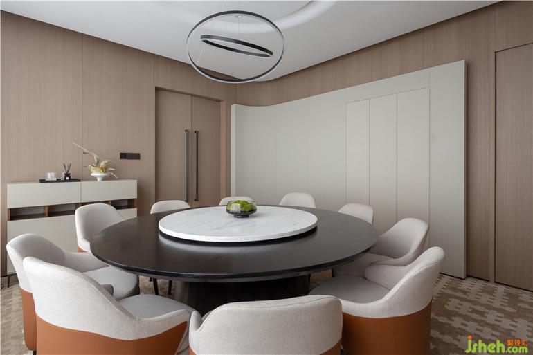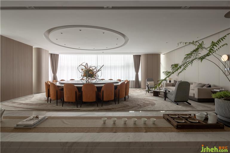 自入口商务洽谈区到包厢再到会议室,由动到静层层递进,设计师引出“序、触、识、乐、隐”五大板块,形成丰富又连续的空间秩序。设计赋予了空间灵魂和生命力,空间可以传达出不同的情绪。在框架中分割空间、处理细节,从而为空间带来柔和安定氛围,又不失精英气质。