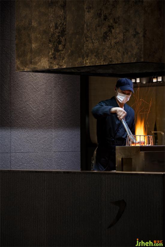 吧台使用纹理独特的深色艺术大理石,日式炉端烧餐厅设计提升了空间的庄重感,更为整体色调起到了点缀。炉端烧位于吧台后侧恰好与进门展示相互融合,厨师烹饪烧烤也成为一种优雅的表演,也意在还原炉端烧在日本本土之景象。