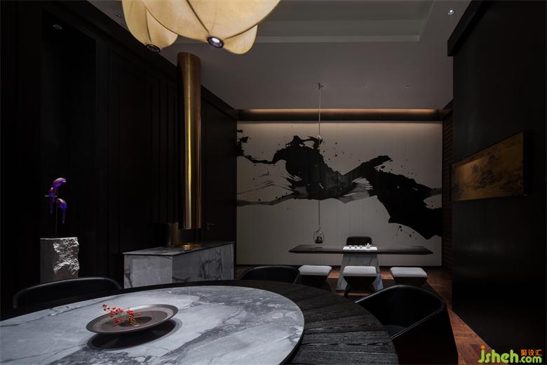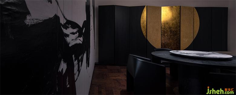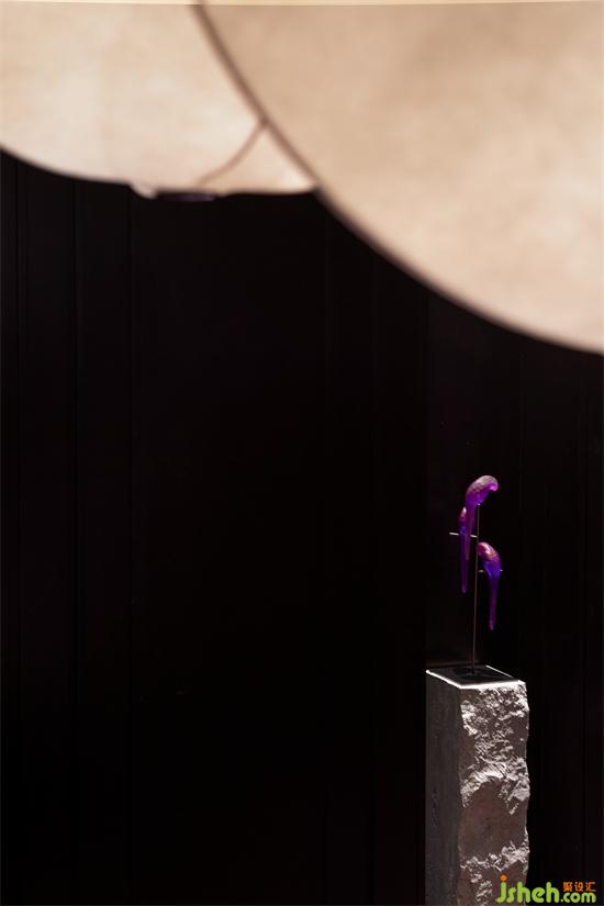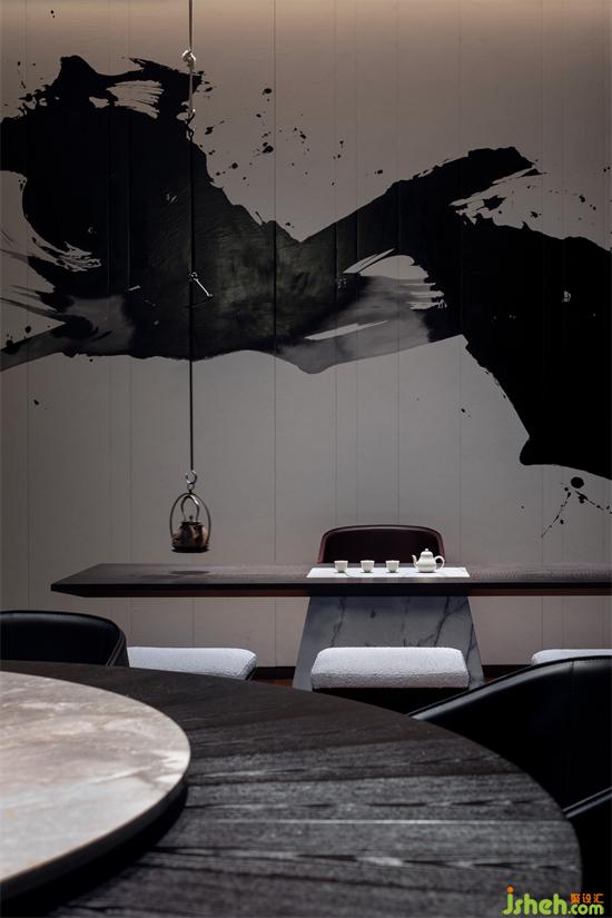 沿着黑色的石材踱步其中,这里每一扇门后面都是我们准备好的礼物,日式炉端烧餐厅设计它们独树一帜别具一格,诉说着不同的故事。灯光照耀到的地方,墙面用白色的杜邦纸铺贴,水墨艺术画作自下而上散布纸上。